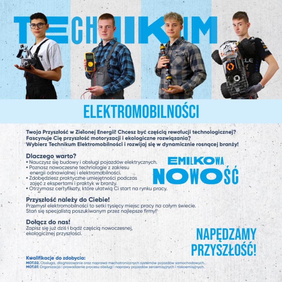| Technik elektromobilności | J. polski, Matematyka, J. obcy, Informatyka | 75 | Wniosek, świadectwo SP, zaświadczenie OKE, 2 zdjęcia, zaświadczenie lekarskie |
