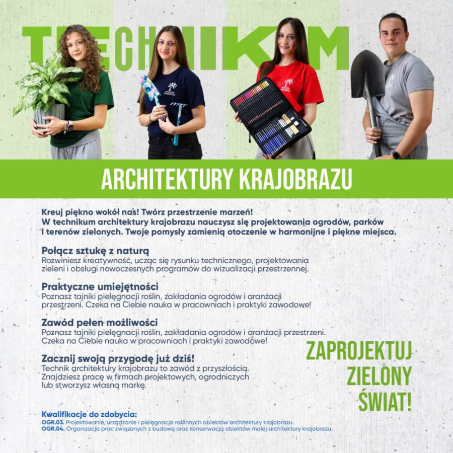 | Technik architektury krajobrazu | J. polski, Matematyka, J. obcy, Biologia | 75 | Wniosek, świadectwo SP, zaświadczenie OKE, 2 zdjęcia, zaświadczenie lekarskie |