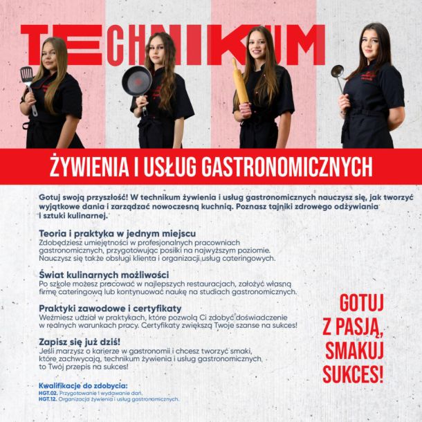 | Technik żywienia i usług gastronomicznych | J. polski, Matematyka, J. obcy, Biologia | 75 |