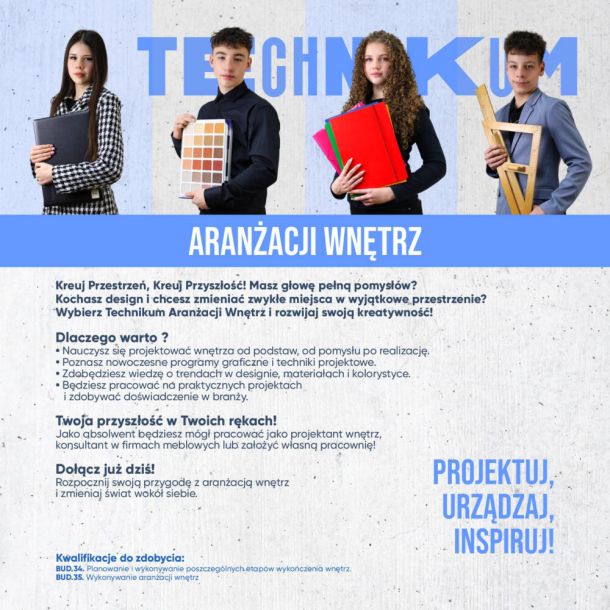 | Technik aranżacji wnętrz | J. polski, Matematyka, J. obcy, Informatyka | 75 |