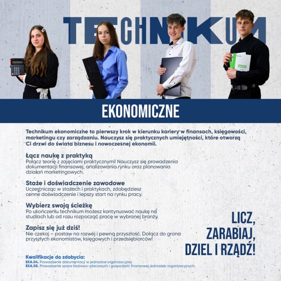 | Technik ekonomista | J. polski, Matematyka, J. obcy, Informatyka | 75 | Standardowe dokumenty + zaświadczenie lekarskie |